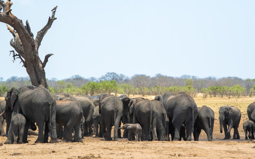 At the airstrip, we sit by the waterhole where we saw the baby elephant being born. It is again bulging with thirsty elephants and we strain to find the little lad that would not yet be two days old. We pick him out, tucked between his mother’s legs, looking strong but dwarfed by the giants around him. Patiently he waits his turn to drink. As we take off, we hope the other ellies will be kind.