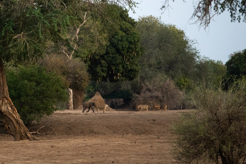 To our astonishment a baby elephant walks onto the scene in front of them. In their surprise, the lions get up and mill around it, not sure of what to do. They seem to be as confused as the little ellie. ‘Where the hell is the mother?” I anguish. This stand-off seems to last forever but eventually the lions regain their composure and they all charge into the bush, out of site.