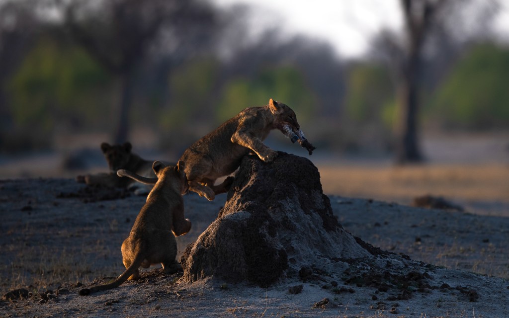 Sure enough, we find them quickly but again we are reminded of the severity of the drought and just how tough it is for the herbivores. They are very weak, and the lions are taking full advantage. One of the females devours the remains of a baby elephant while full-bellied cubs play frivolously with the remains of a zebra’s leg. For the carnivores, this is a time of plenty.