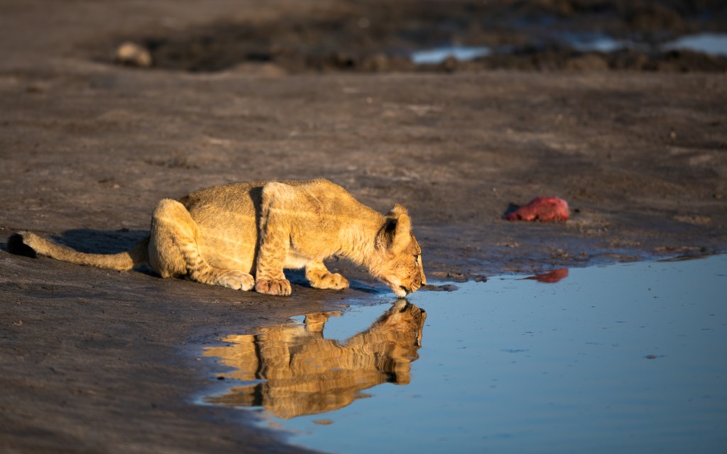 Dickson manoeuvres us into a perfect position and the lions hunker down in a line to drink. Two adults and six cubs; eyes shining in the morning sun while their reflections ripple below them. Photo opportunities like these are rare and our memory cards rapidly fill as we try to capture the essence of this unique moment. With such perfect conditions, our challenge will not be if will we get a great shot, but rather, which out of our hundreds will we choose.